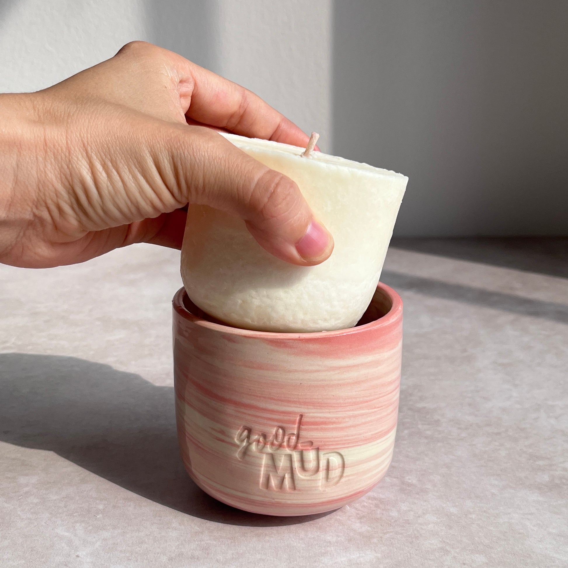 Solo puedes usarlo en los envases de Good Mūd de cerámica o de cemento, no pueden ser usados como vela pilar.