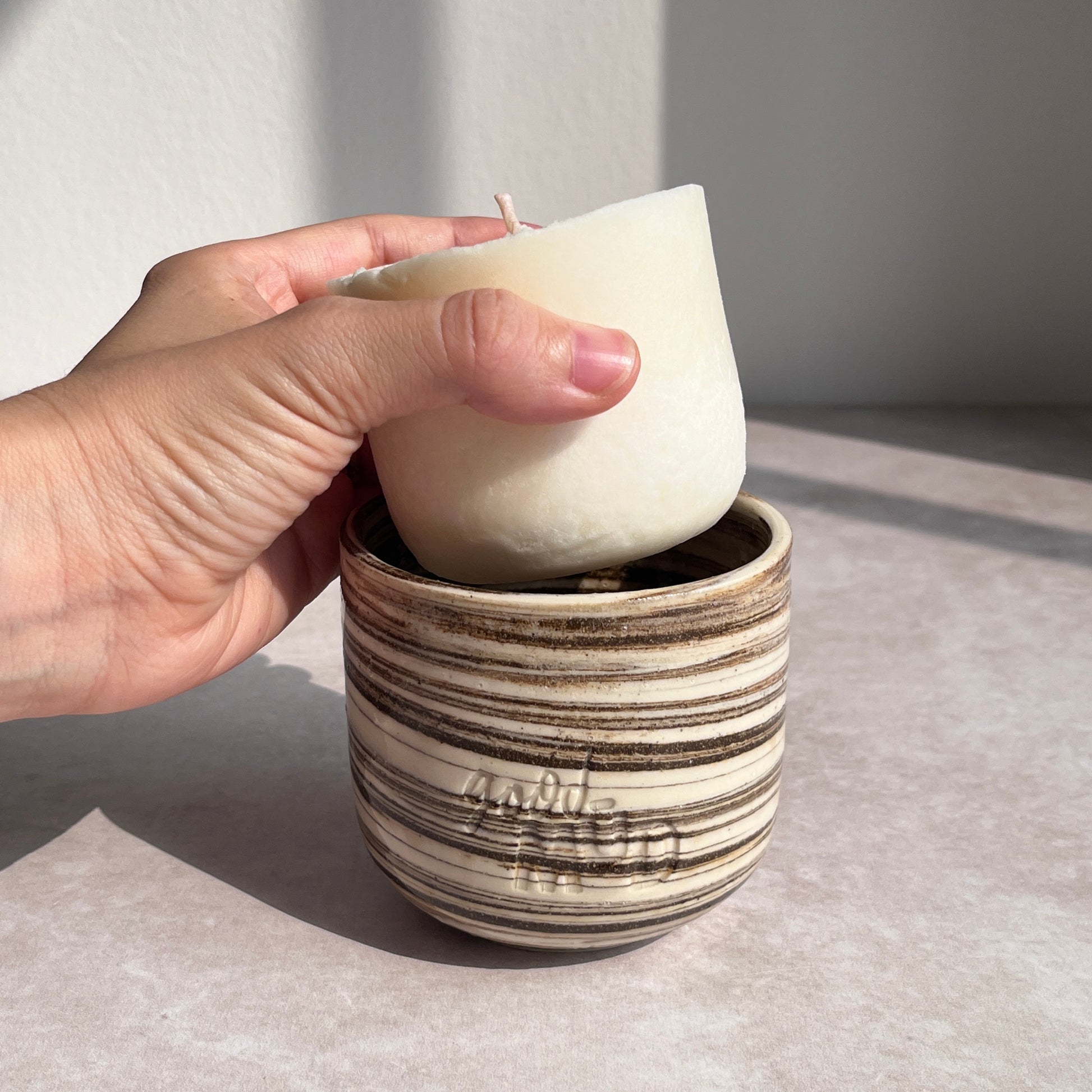 Solo pueden ser usados en los envases de Good Mūd de cerámica o de cemento, no puedes usarlos como vela pilar.